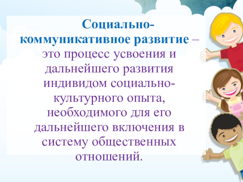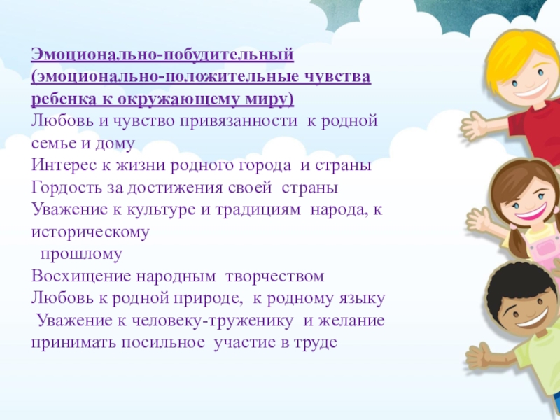Основной целью этого направления является позитивная социализация детей дошкольного возраста, приобщение их к социокультурным нормам, традициям семьи, общества и государства.