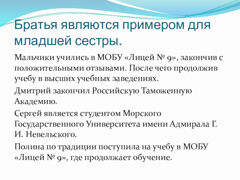 Полина по традиции поступила на учебу в МОБУ «Лицей № 9», где продолжает обучение.