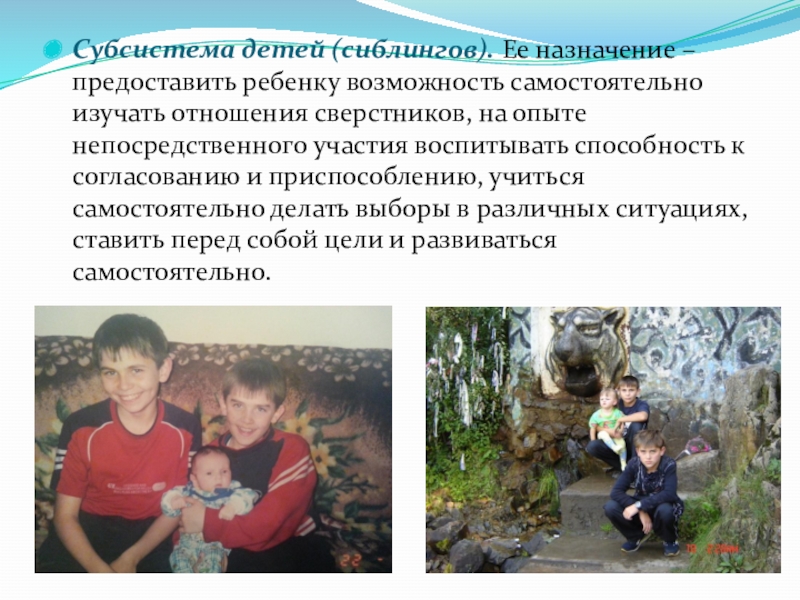 Слайд 21Субсистема детей (сиблингов). Ее назначение – предоставить ребенку возможность самостоятельно изучать отношения