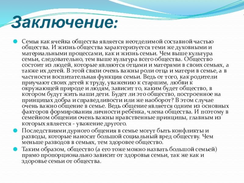общества характеризуется теми же духовными и материальными процессами, как и жизнь семьи. Чем выше культура семьи, следовательно, тем выше культура всего общества. Общество состоит из людей, которые являются отцами и матерями в своих семьях, а также их детей. В этой связи очень важны роли отца и матери в семье, а в частности воспитательная функция семьи. Ведь от того, как родители приучают своих детей к труду, уважению к старшим, любви к окружающей природе и людям, зависит то, каким будет общество, в котором будут жить наши дети. Будет ли это общество, построенное на принципах добра и справедливости или же наоборот? В этом случае очень важно общение в семье. Ведь общение является одним из основных факторов формирования личности ребёнка, члена общества. И поэтому в семейном общении очень важны нравственные принципы, главным из которых является - уважение другого.