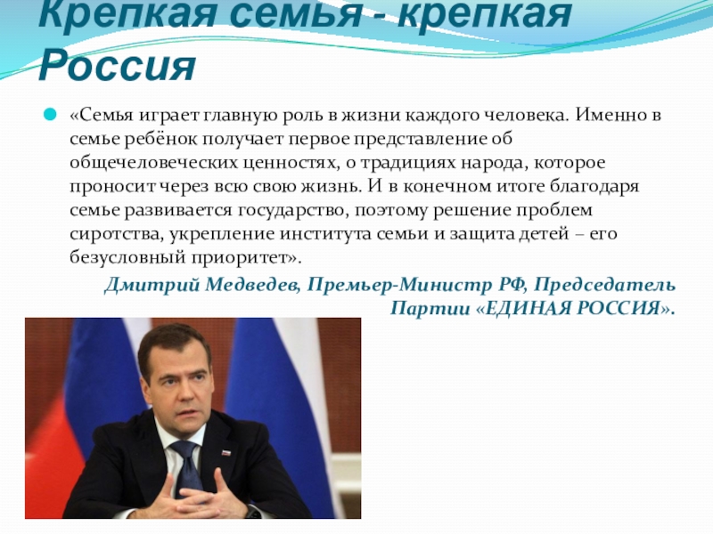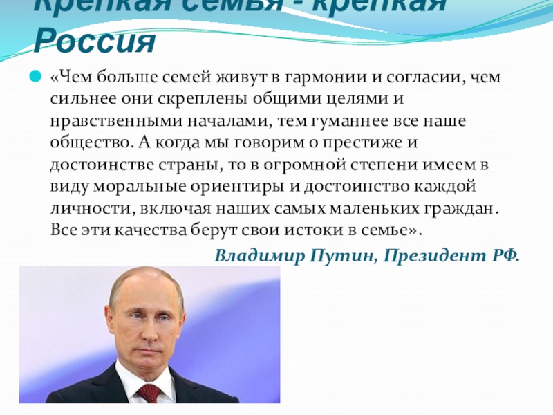 согласии, чем сильнее они скреплены общими целями и нравственными началами, тем гуманнее все наше общество. А когда мы говорим о престиже и достоинстве страны, то в огромной степени имеем в виду моральные ориентиры и достоинство каждой личности, включая наших самых маленьких граждан. Все эти качества берут свои истоки в семье».