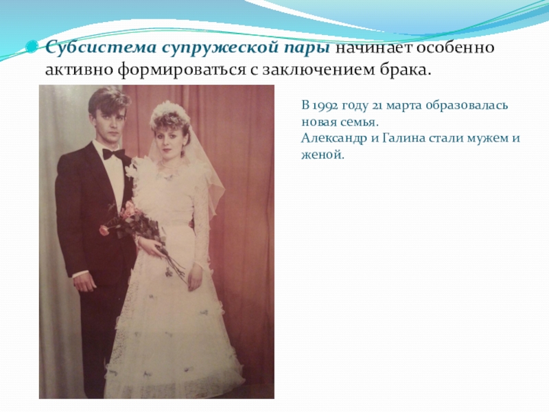 Слайд 15Субсистема супружеской пары начинает особенно активно формироваться с заключением брака.