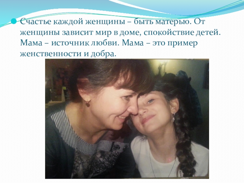 доме, спокойствие детей. Мама – источник любви. Мама – это пример женственности и добра.