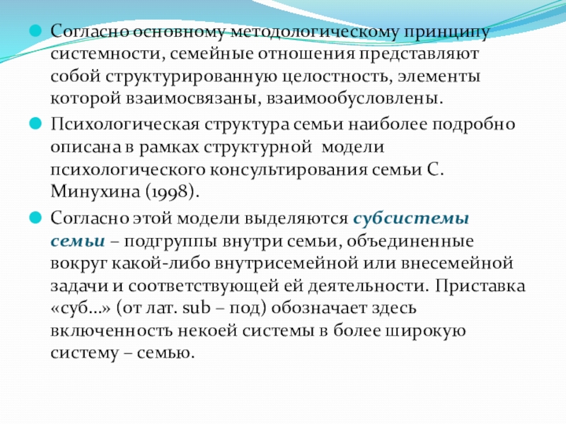 Слайд 14Согласно основному методологическому принципу системности, семейные отношения представляют собой структурированную целостность,