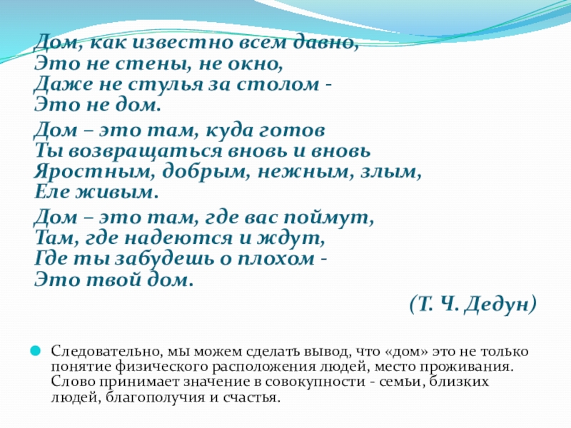 Следовательно, мы можем сделать вывод, что «дом» это не только понятие физического расположения людей, место проживания. Слово принимает значение в совокупности - семьи, близких людей, благополучия и счастья.