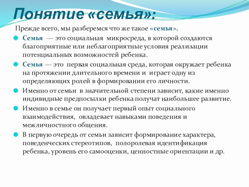 Именно в семье он получает первый опыт социального взаимодействия, овладевает навыками поведения и межличностного общения.