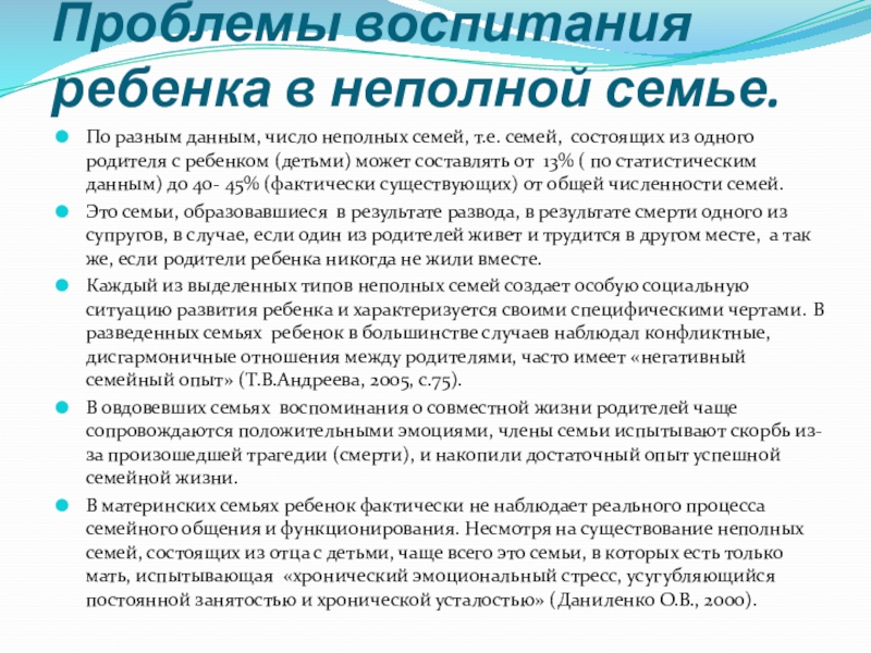 Каждый из выделенных типов неполных семей создает особую социальную ситуацию развития ребенка и характеризуется своими специфическими чертами. В разведенных семьях ребенок в большинстве случаев наблюдал конфликтные, дисгармоничные отношения между родителями, часто имеет «негативный семейный опыт» (Т.В.Андреева, 2005, с.75).