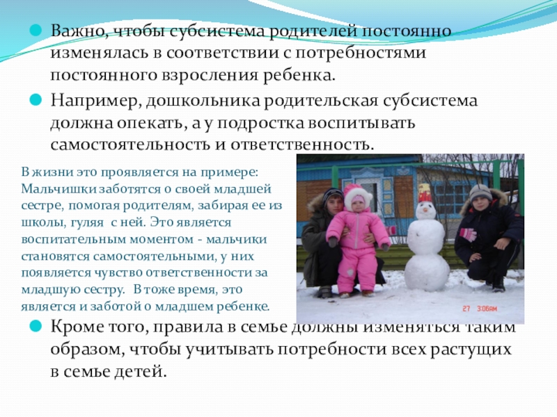 Например, дошкольника родительская субсистема должна опекать, а у подростка воспитывать самостоятельность и ответственность.