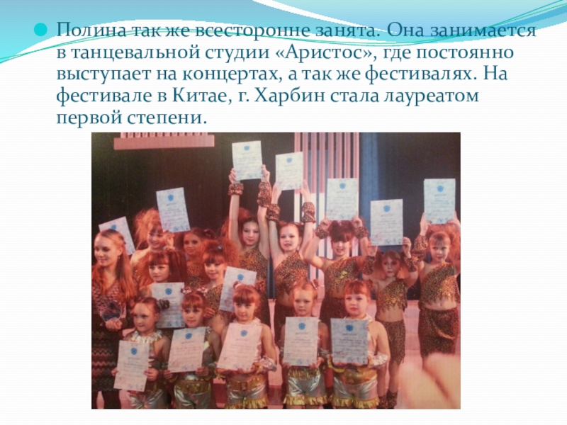 Слайд 25Полина так же всесторонне занята. Она занимается в танцевальной студии «Аристос»,