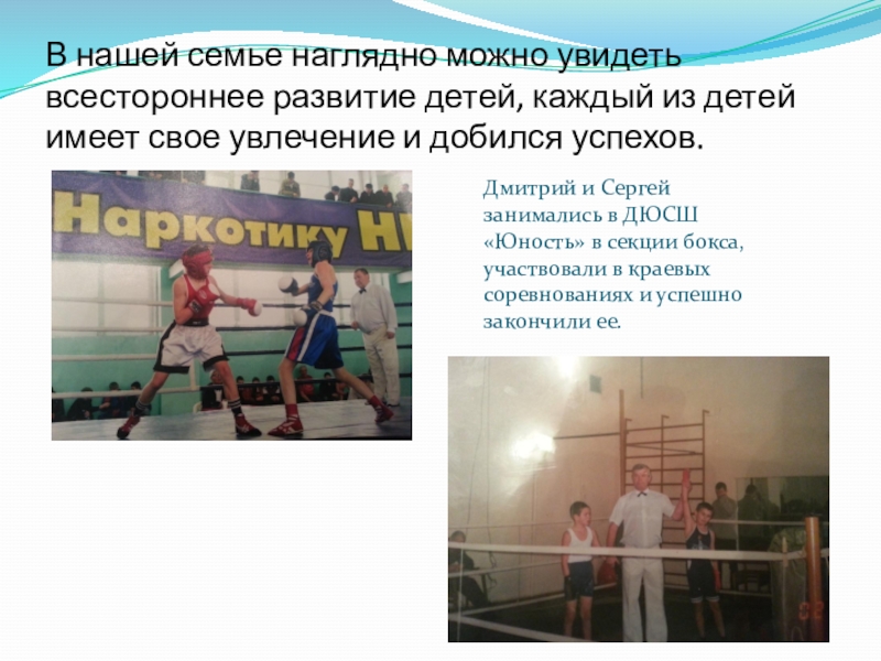 Дмитрий и Сергей занимались в ДЮСШ «Юность» в секции бокса, участвовали в краевых соревнованиях и успешно закончили ее.