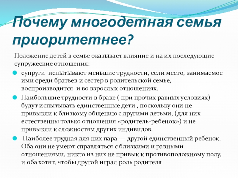 Наибольшие трудности в браке ( при прочих равных условиях) будут испытывать единственные дети , поскольку они не привыкли к близкому общению с другими детьми, (для них естественны только отношения «родитель-ребенок») и не привыкли к сложностям других индивидов.
