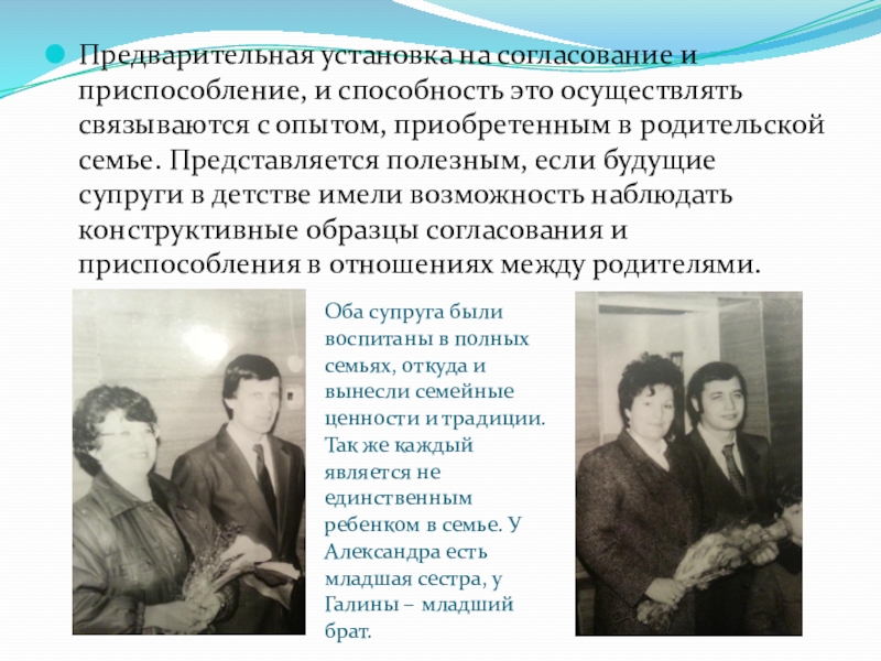 с опытом, приобретенным в родительской семье. Представляется полезным, если будущие супруги в детстве имели возможность наблюдать конструктивные образцы согласования и приспособления в отношениях между родителями.
