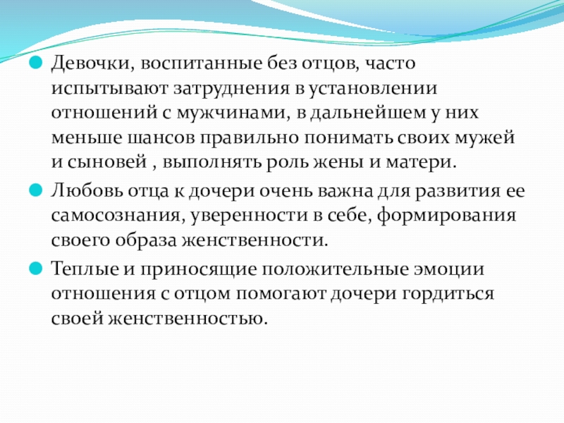 Слайд 37Девочки, воспитанные без отцов, часто испытывают затруднения в установлении отношений с
