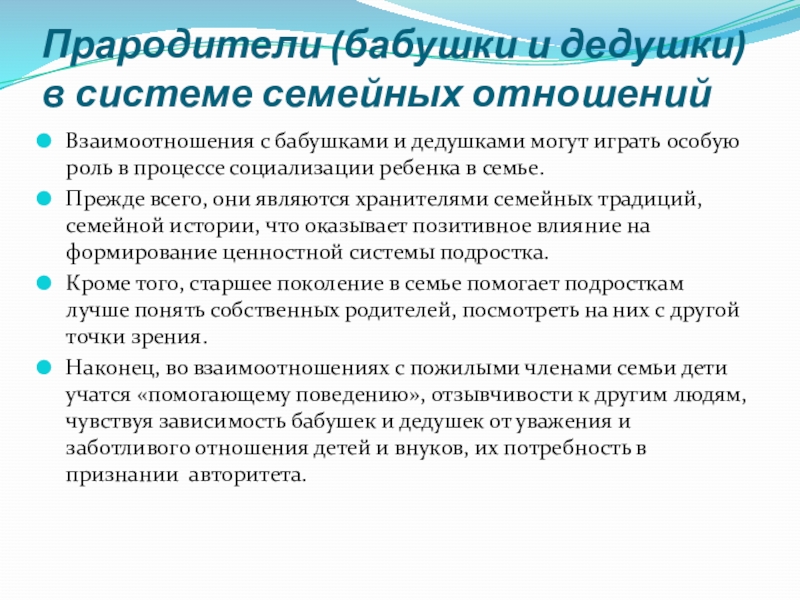 Слайд 33Прародители (бабушки и дедушки) в системе семейных отношений