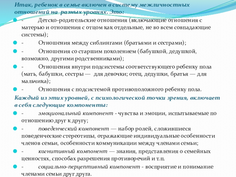 Слайд 26Итак, ребенок в семье включен в систему межличностных отношений на разных