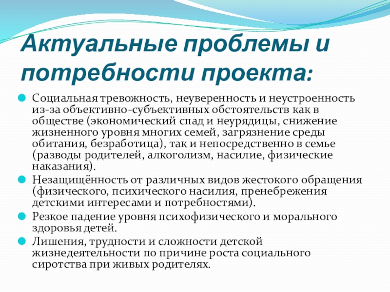 обстоятельств как в обществе (экономический спад и неурядицы, снижение жизненного уровня многих семей, загрязнение среды обитания, безработица), так и непосредственно в семье (разводы родителей, алкоголизм, насилие, физические наказания).