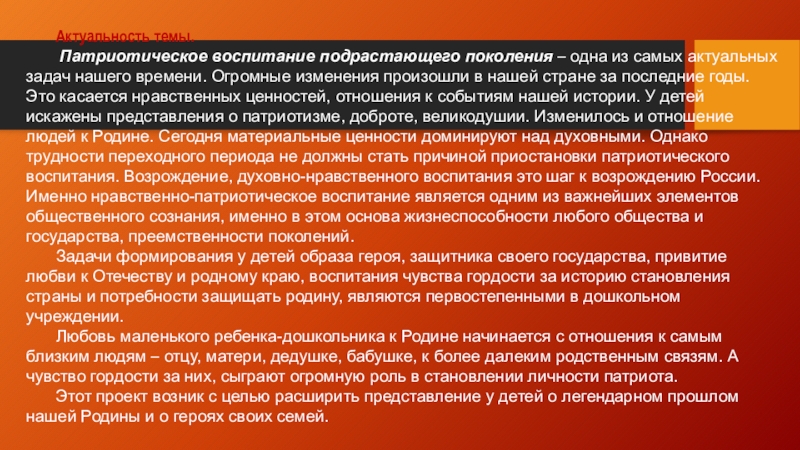 нашего времени. Огромные изменения произошли в нашей стране за последние годы. Это касается нравственных ценностей, отношения к событиям нашей истории. У детей искажены представления о патриотизме, доброте, великодушии. Изменилось и отношение людей к Родине. Сегодня материальные ценности доминируют над духовными. Однако трудности переходного периода не должны стать причиной приостановки патриотического воспитания. Возрождение, духовно-нравственного воспитания это шаг к возрождению России. Именно нравственно-патриотическое воспитание является одним из важнейших элементов общественного сознания, именно в этом основа жизнеспособности любого общества и государства, преемственности поколений.