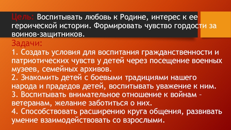 Задачи формирования у детей образа героя, защитника своего государства, привитие любви к Отечеству и родному краю, воспитания чувства гордости за историю становления страны и потребности защищать родину, являются первостепенными в дошкольном учреждении.