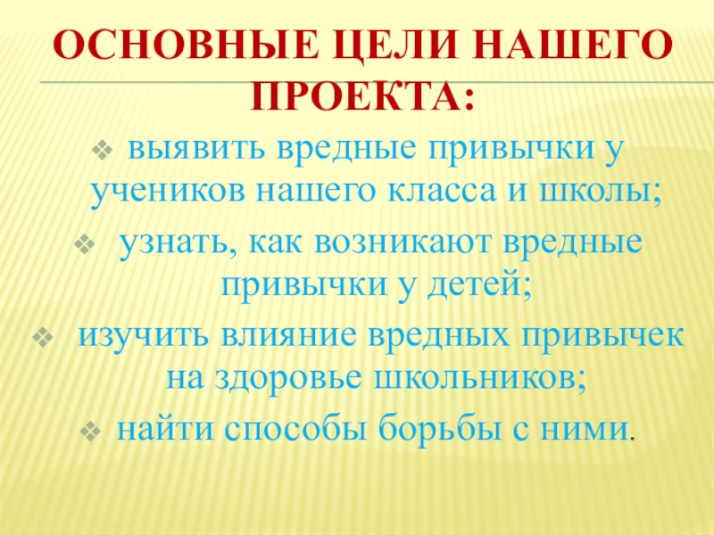 ОСНОВНЫЕ ЦЕЛИ НАШЕГО ПРОЕКТА:выявить вредные привычки у учеников нашего класса и школы; узнать, как возникают вредные привычки у детей; изучить влияние вредных привычек на здоровье школьников;найти способы борьбы с ними.