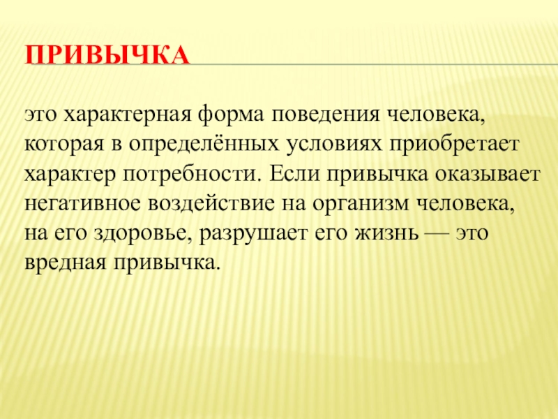 ПРИВЫЧКАэто характерная форма поведения человека, которая в определённых условиях приобретает характер потребности. Если привычка оказывает негативное воздействие
