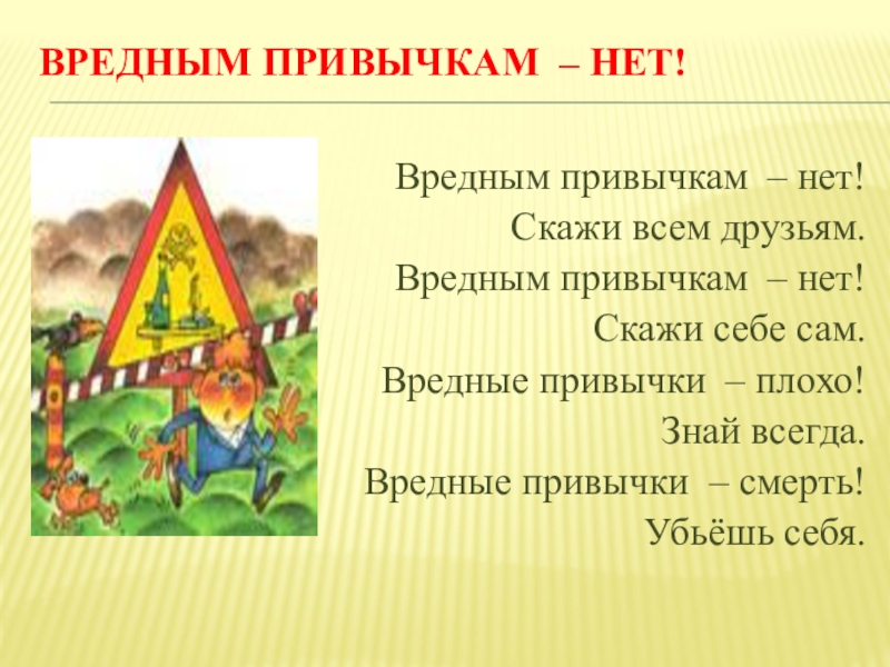 ВРЕДНЫМ ПРИВЫЧКАМ – НЕТ! Вредным привычкам – нет! Скажи всем друзьям.Вредным привычкам – нет! Скажи себе сам.Вредные