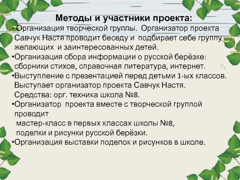 Методы и участники проекта: Организация творческой группы. Организатор проекта Савчук Настя проводит беседу и подбирает себе