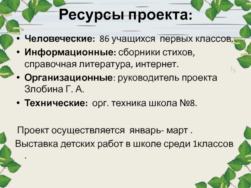 Ресурсы проекта: Человеческие: 86 учащихся первых классов.Информационные: сборники стихов, справочная литература, интернет.Организационные: руководитель проекта Злобина Г. А.Технические: