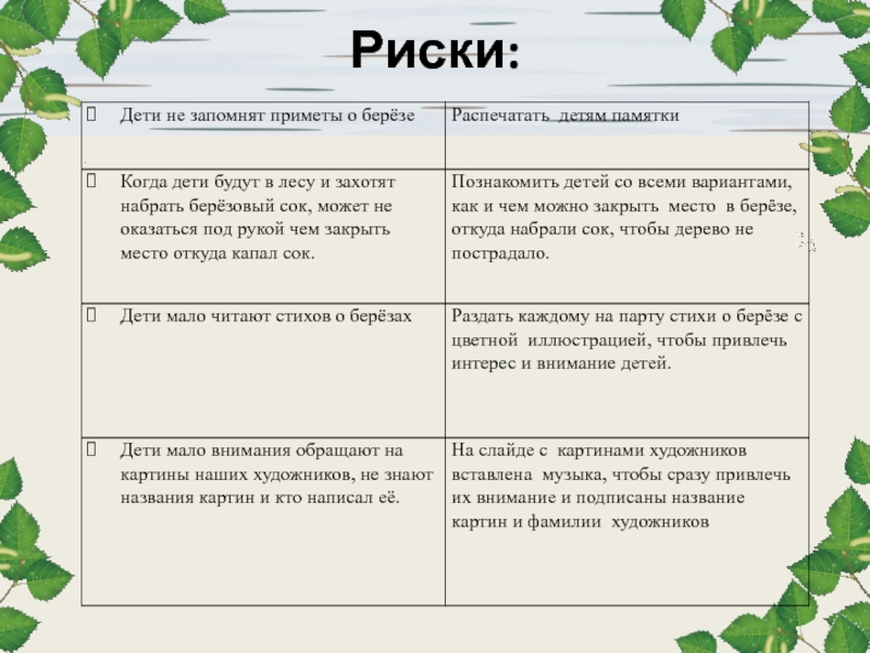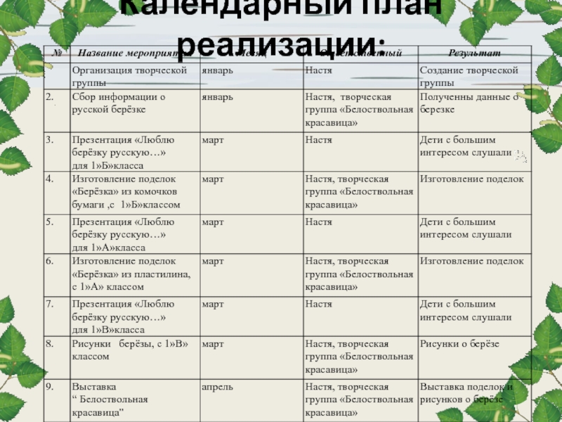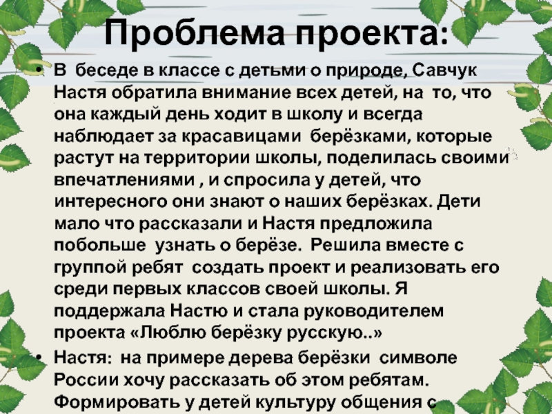 обратила внимание всех детей, на то, что она каждый день ходит в школу и всегда наблюдает за красавицами берёзками, которые растут на территории школы, поделилась своими впечатлениями , и спросила у детей, что интересного они знают о наших берёзках. Дети мало что рассказали и Настя предложила побольше узнать о берёзе. Решила вместе с группой ребят создать проект и реализовать его среди первых классов своей школы. Я поддержала Настю и стала руководителем проекта «Люблю берёзку русскую..»