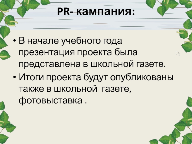 PR- кампания: В начале учебного года презентация проекта была представлена в школьной газете.Итоги проекта будут опубликованы также