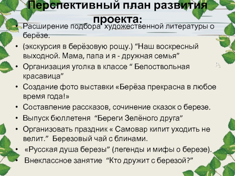 Перспективный план развития проекта:  Расширение подбора художественной литературы о берёзе.(экскурсия в берёзовую рощу.) “Наш воскресный выходной.