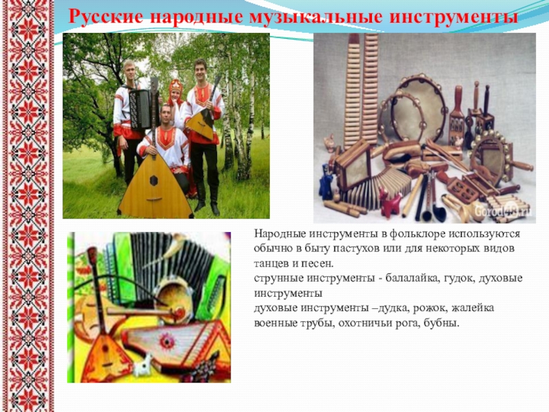 струнные инструменты - балалайка, гудок, духовые инструменты