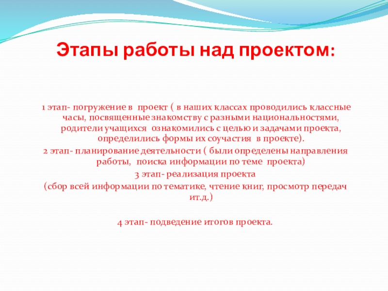 классах проводились классные часы, посвященные знакомству с разными национальностями, родители учащихся ознакомились с целью и задачами проекта, определились формы их соучастия в проекте).