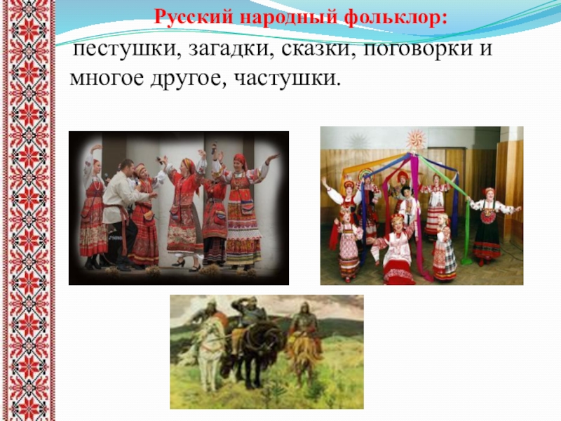 пестушки, загадки, сказки, поговорки и многое другое, частушки.