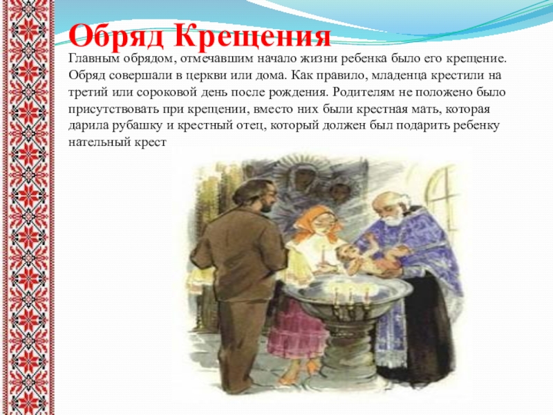 крещение. Обряд совершали в церкви или дома. Как правило, младенца крестили на третий или сороковой день после рождения. Родителям не положено было присутствовать при крещении, вместо них были крестная мать, которая дарила рубашку и крестный отец, который должен был подарить ребенку нательный крест
