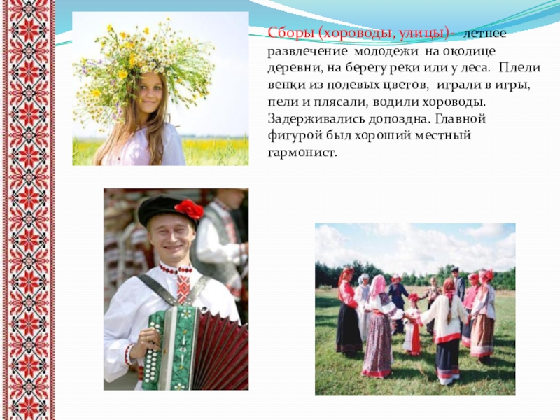 Слайд 10Сборы (хороводы, улицы)- летнее развлечение молодежи на околице деревни, на берегу