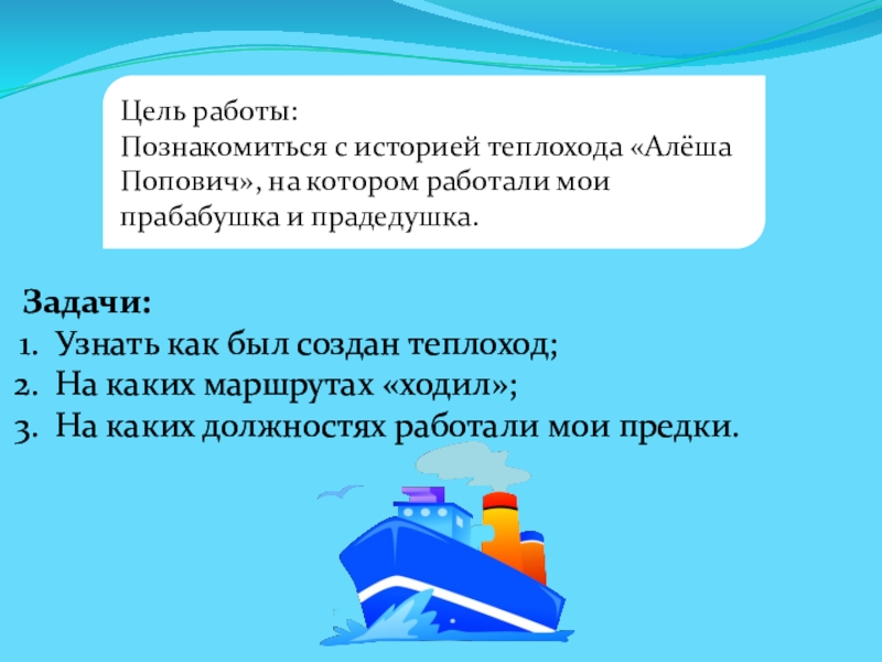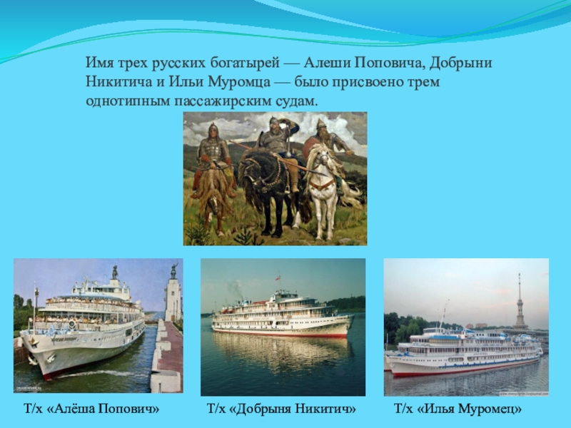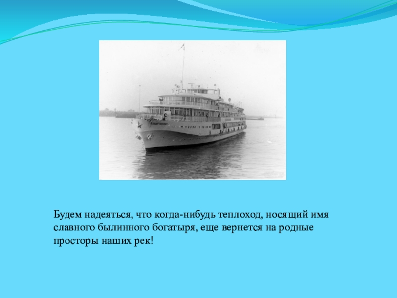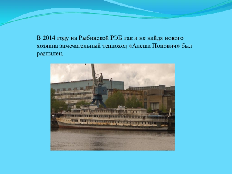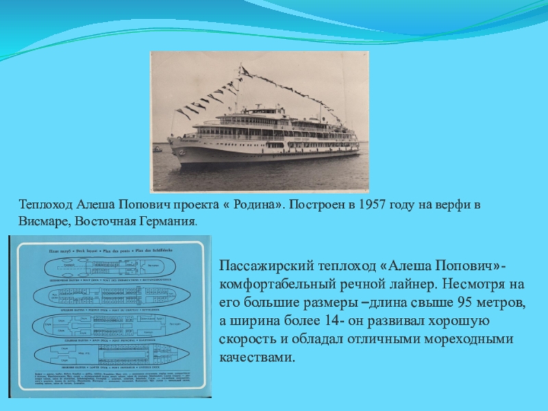 Пассажирский теплоход «Алеша Попович»- комфортабельный речной лайнер. Несмотря на его большие размеры –длина свыше 95 метров, а ширина более 14- он развивал хорошую скорость и обладал отличными мореходными качествами.