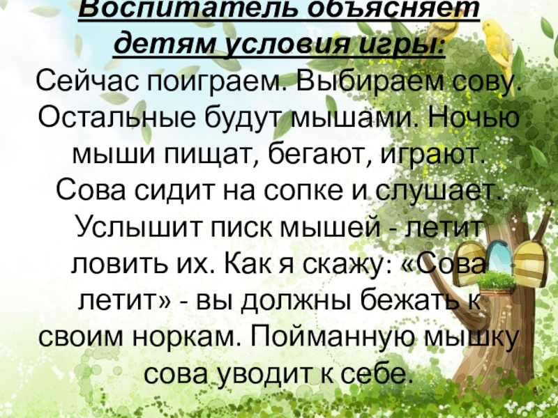 Слайд 8Воспитатель объясняет детям условия игры: Сейчас поиграем. Выбираем сову. Остальные будут мышами.
