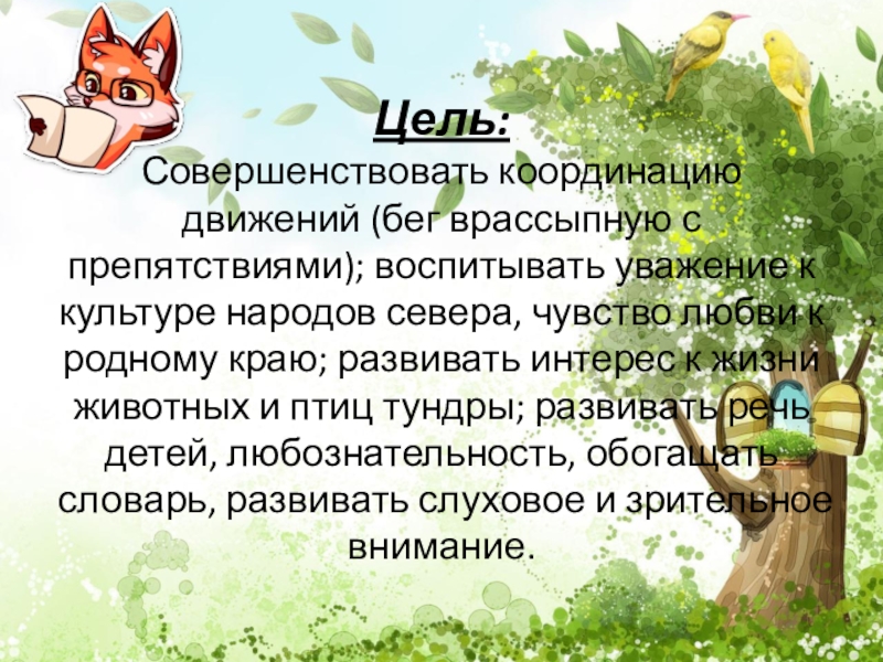 культуре народов севера, чувство любви к родному краю; развивать интерес к жизни животных и птиц тундры; развивать речь детей, любознательность, обогащать словарь, развивать слуховое и зрительное внимание.