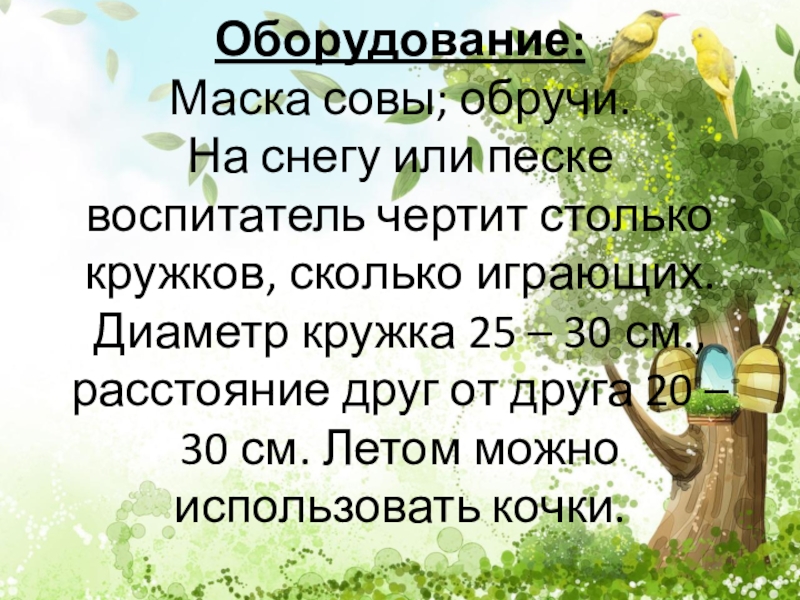 Слайд 7Оборудование: Маска совы; обручи. На снегу или песке воспитатель чертит столько кружков,