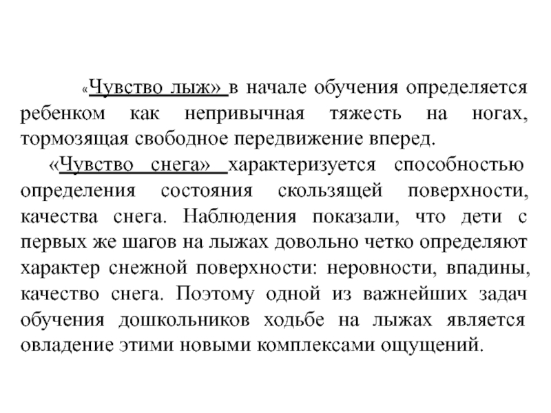 «Чувство снега» характеризуется способностью определения состояния скользящей поверхности, качества снега. Наблюдения показали, что дети с первых же шагов на лыжах довольно четко определяют характер снежной поверхности: неровности, впадины, качество снега. Поэтому одной из важнейших задач обучения дошкольников ходьбе на лыжах является овладение этими новыми комплексами ощущений.