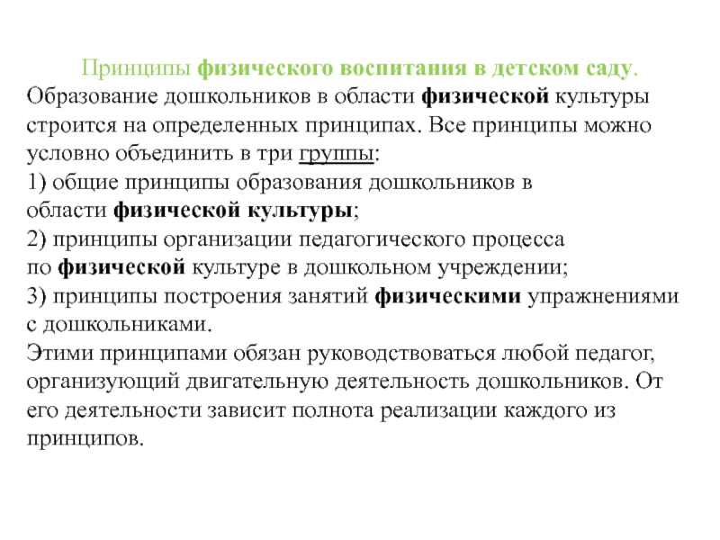 Этими принципами обязан руководствоваться любой педагог, организующий двигательную деятельность дошкольников. От его деятельности зависит полнота реализации каждого из принципов.