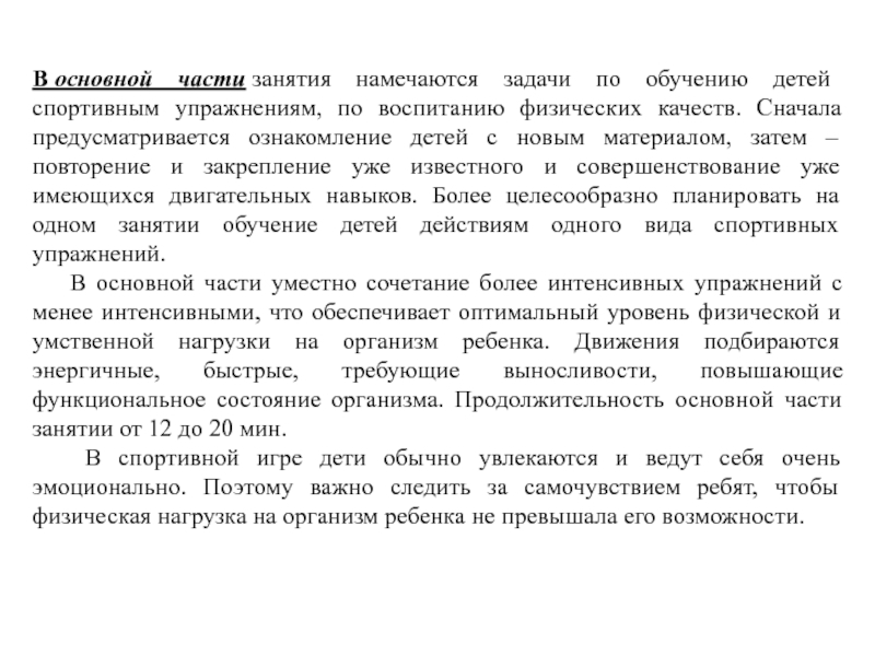 Слайд 19В основной части занятия намечаются задачи по обучению детей спортивным упражнениям, по воспитанию
