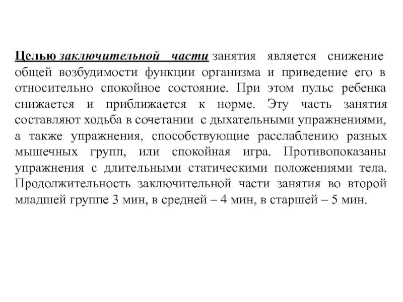 в относительно спокойное состояние. При этом пульс ребенка снижается и приближается к норме. Эту часть занятия составляют ходьба в сочетании с дыхательными упражнениями, а также упражнения, способствующие расслаблению разных мышечных групп, или спокойная игра. Противопоказаны упражнения с длительными статическими положениями тела. Продолжительность заключительной части занятия во второй младшей группе 3 мин, в средней – 4 мин, в старшей – 5 мин.