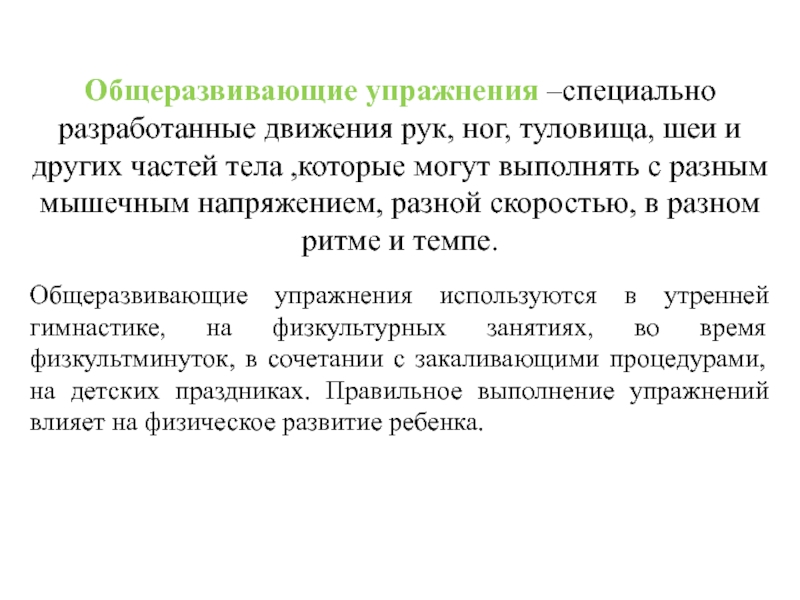 Слайд 9Общеразвивающие упражнения –специально разработанные движения рук, ног, туловища, шеи и других