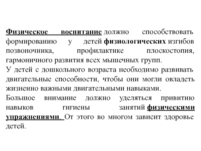 Слайд 5Физическое воспитание должно способствовать формированию у детей физиологических изгибов позвоночника, профилактике плоскостопия, гармоничного развития