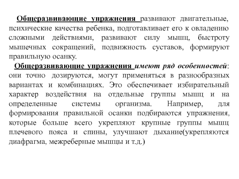 Слайд 10 Общеразвивающие упражнения развивают двигательные, психические качества ребенка, подготавливает его к