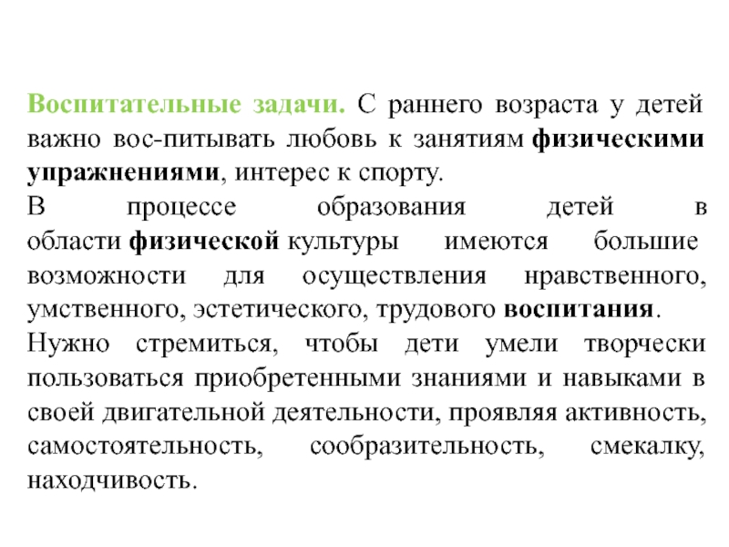 В процессе образования детей в области физической культуры имеются большие возможности для осуществления нравственного, умственного, эстетического, трудового воспитания.