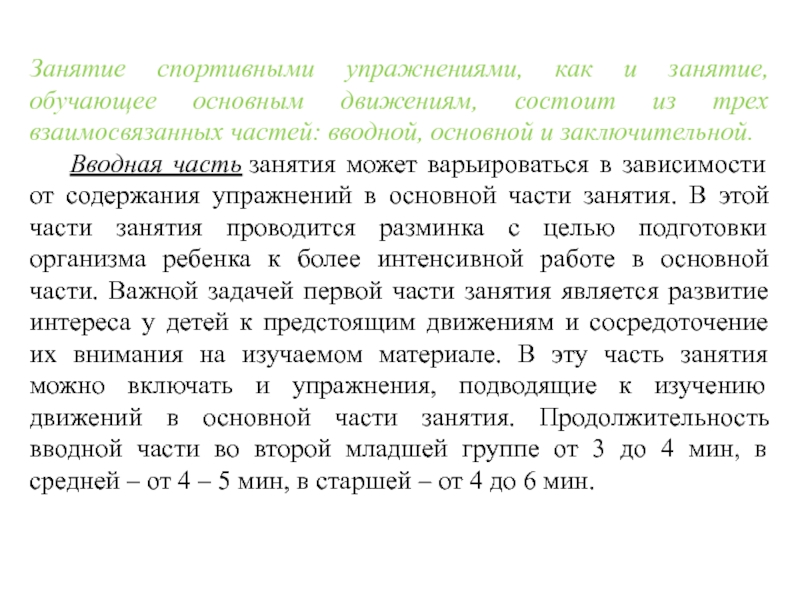 Слайд 18Занятие спортивными упражнениями, как и занятие, обучающее основным движениям, состоит из