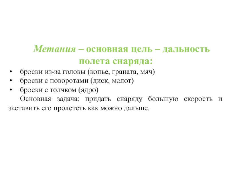 Слайд 24Метания – основная цель – дальность полета снаряда: