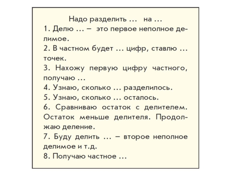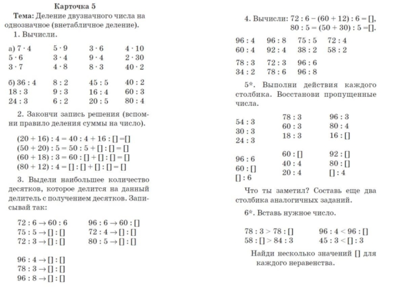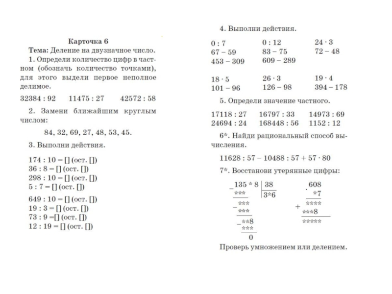 делить однозначное или двузначное число на однозначное нацело или с остатком;